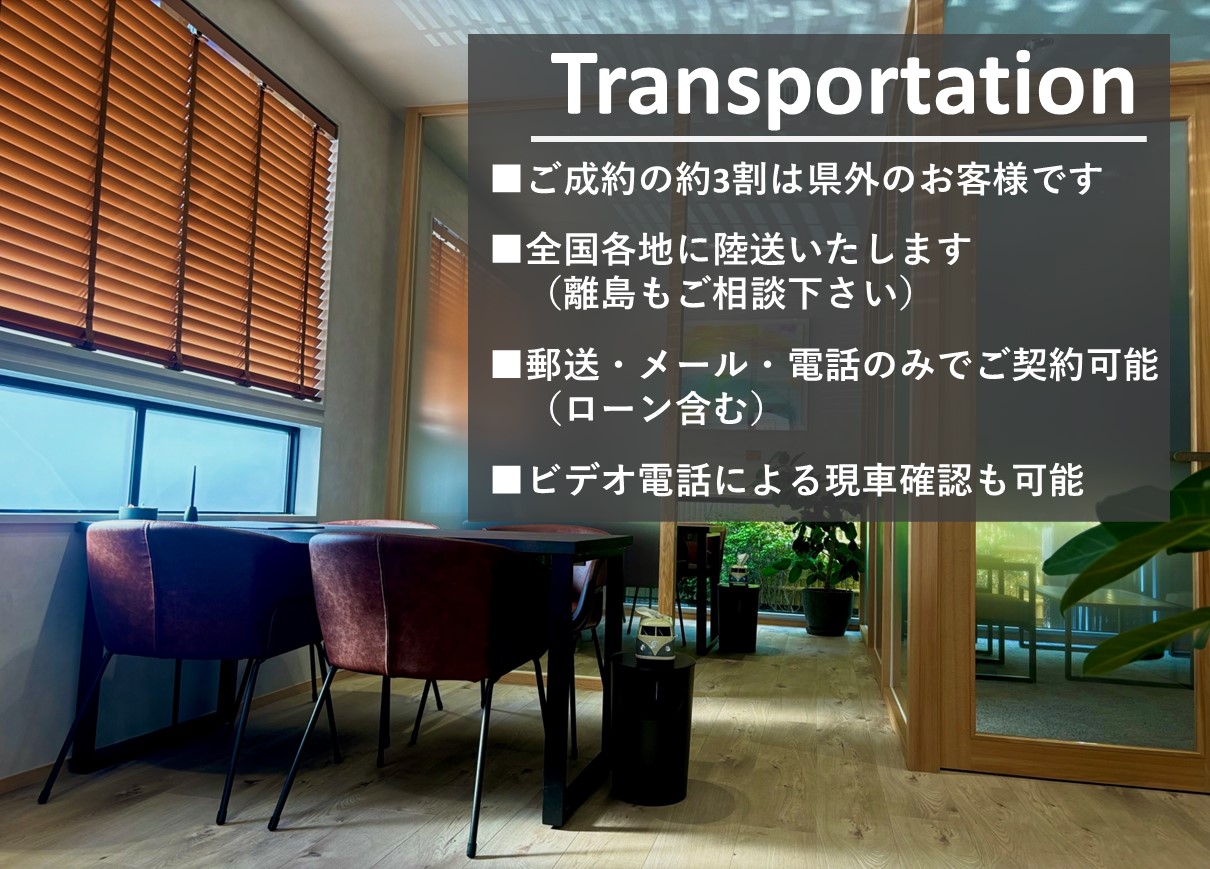 【Transportation】有難いことに全国からお車をご購入いただいております。今では約3割は県外となります。ご自宅・職場・港止めなど納車場所も柔軟に対応いたします。ビデオの現車確認も歓迎です。
