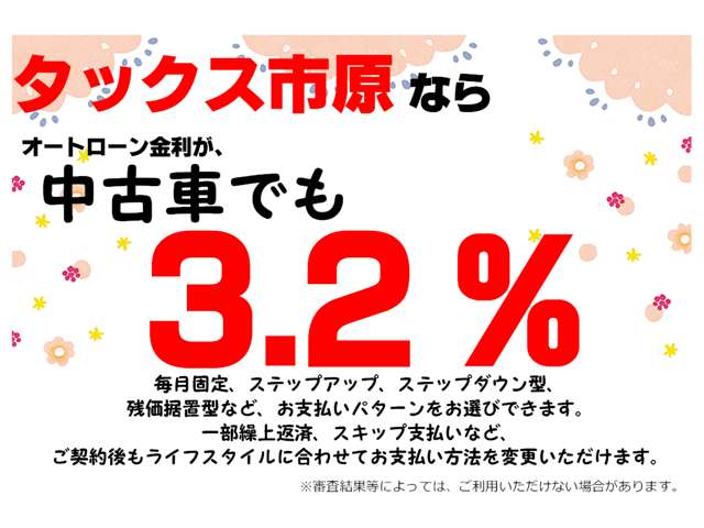 通常のオートローンから、月々のお支払いをお安くできる残価設定タイプのローン、ローン中でも月々の額や回数を変更可能なローンなど、お客様に合わせたローンをご提案させて頂きます。